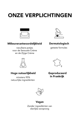 De verpakking is geoptimaliseerd qua volume(3) (-68%) en gewicht(3) (-27%). Ze is 100% recycleerbaar.De potjes zijn navulbaar. De deksels zijn 100% recycleerbaar.
