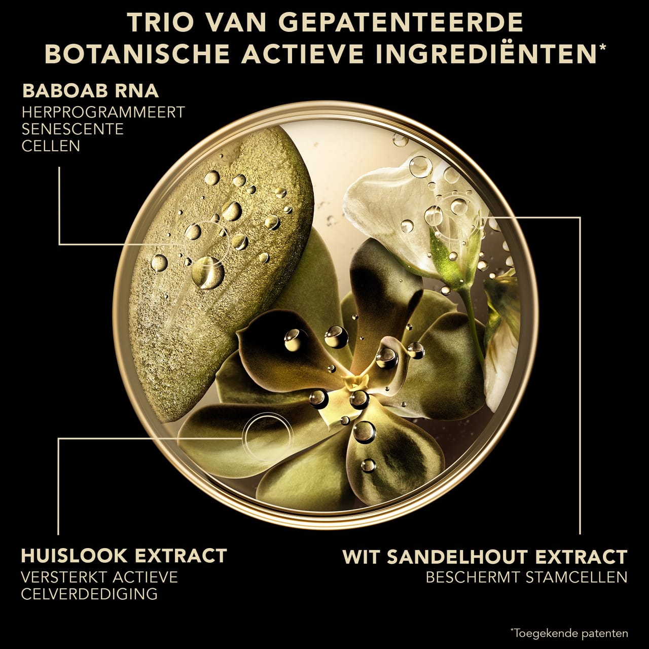 De kern van de formule wordt gevormd door een trio van kostbare botanische actieve ingrediënten - wit sandelhoutextract, extract van jovibarba en baobab RNA - die de boodschapperproteïnen van cellulaire langlevendheid*** reactiveren om alle tekenen van veroudering te corrigeren. Gecombineerd met niacinamide, een dermatologisch actief ingrediënt, voor een verbeterde doeltreffendheid en papaïne om de huidtextuur te verfijnen en de glans te versterken.