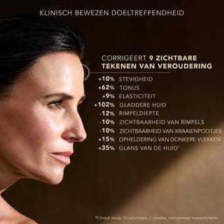 De krachtigste Globale Anti-Aging behandeling* om 9 zichtbare tekenen van veroudering te corrigeren**: stevigheid, teint, elasticiteit, onregelmatigheid van textuur, diepte en zichtbaarheid van rimpels, egale teint, donkere vlekken en dofheid.